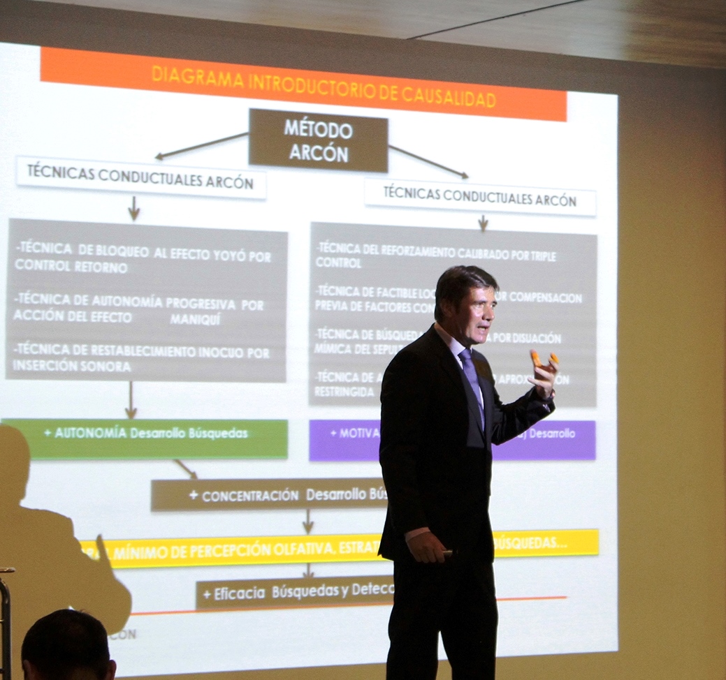 En ocasiones, al iniciar cursos oficiales Método Arcón, constatamos que una parte de los alumnos que participan con perros, muchos instructores oficiales del sistema tradicional (ya formados con el sistema tradicional, en Unidades Caninas oficiales de importantes Cuerpos policiales, de bomberos o militares de diversos países como por ejemplos Brasil, Colombia, México, Guatemala, Honduras, El Salvador, Chile, Ecuador, Venezuela, Andorra, Ucrania, Portugal, España, etc.), estaban en principio convencidos de que sus perros realizaban ya con anterioridad las operaciones. de búsqueda y detección de supervivientes sepultados con un importante grado de efectividad, porque sus ejemplares (formados con el sistema tradicional, evitándose simplemente en lo posible, durante su proceso formativo, las pautas de apoyo por parte de la guía) en las operaciones de búsqueda que realizaban antes de iniciar el curso, detectaban la persona viva sepultada venteando correctamente, en amplias superficies, y en breve espacio de tiempo, no obstante todos ellos constataban sólidamente y con decepcionante. sorpresa en el primer o segundo día de cada Curso Método Arcón, que cuando se hermetizaba aún más la emisión odorífera emitida al exterior por la persona (reproduciendo así fielmente los ínfimos valores odoríferos que resultarán emitidos al exterior en la casi totalidad de situaciones reales de siniestros) ya no detectaban en absoluto ( esto se debe, por ejemplo, a que con el condicionamiento operante y ciertas pautas añadidas, tan solo resulta factible en el perro lograr una mera independencia, autonomía, física de desplazamiento, pero en absoluto conseguir y mucho menos optimizar la esencial autonomía psíquica, respecto al guía, extremadamente diferente a lo aparentado, y genericamente confundido, en el primer caso, lo cual solo es posible obtener con la adecuada aplicación, especialmente dificil, de las complejas técnicas Método Arcón), una grave circunstancia que sin embargo descubrían con inmensa. y noble satisfacción, quedaba totalmente solventada, de forma progresiva, con la aplicación de las técnicas del Método Arcón (incrementándose de forma sustancial y progresiva la autonomía psíquica, motivación específica, y consecuentes concentración y rendimiento perceptivo del perro, optimizándose su umbral mínimo de percepción olfativa (mínima energía odorífera que ha de ser emitida para que el individuo la logre detectar, discriminar e identificar correctamente), las cuales iban permitiendo en todos los casos a los ejemplares formados previamente, durante años, con el sistema tradicional, no solo detectar idénticos dosis de emisión odorífera a las que antes no lograban percibir (incluso en otros entornos más adversos), sino progresivamente, emisiones sustancialmente menores, circunstancia que todos somos conscientes, en muchos casos, determinará la diferencia entre la vida y la muerte frente a múltiples situaciones futuras como desastres naturales o antrópicos.