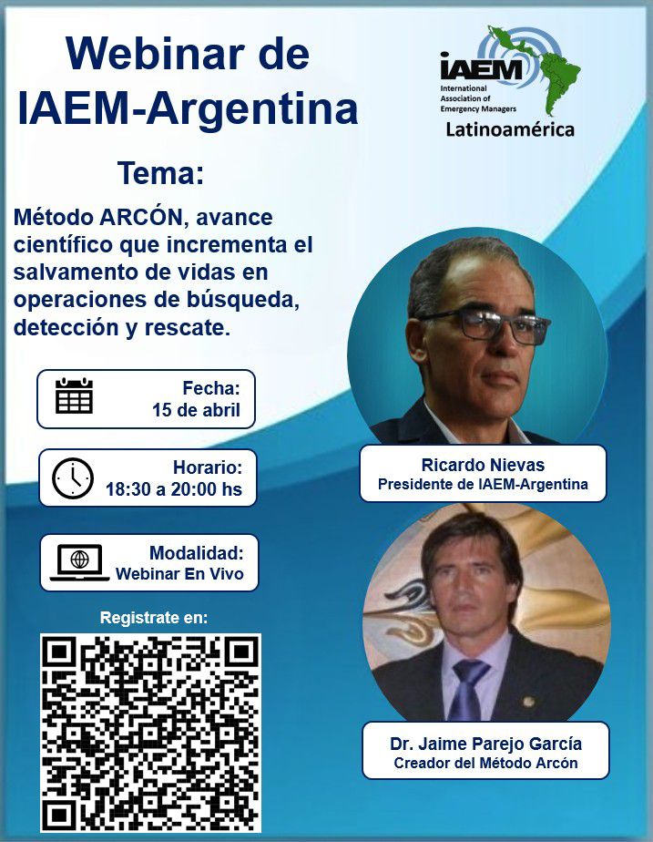 Próximo 15 de abril Webinar IAEM-Argentina, International Association Emergency Managers, Tema: Método ARCÓN, avance científico que incrementa el salvamento de vidas en operaciones de búsqueda, detección y rescate.